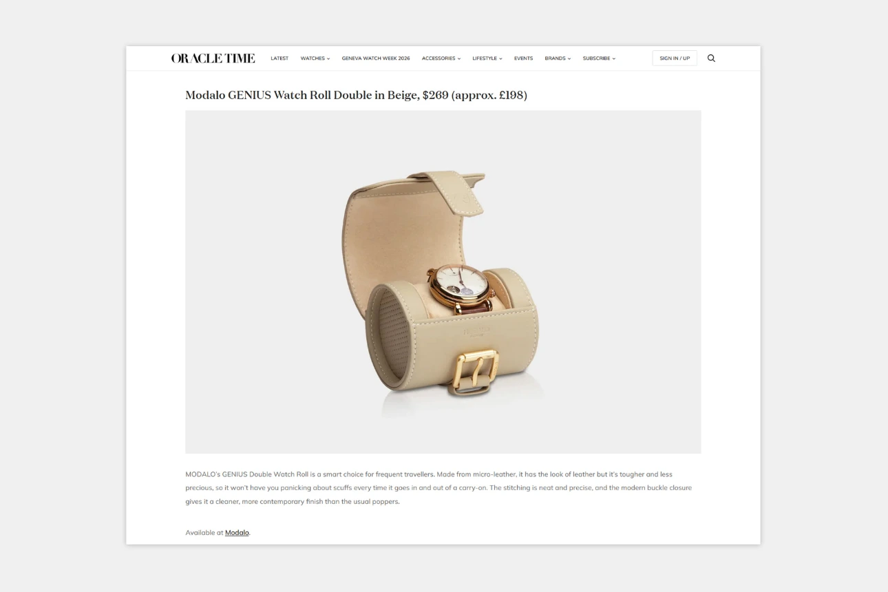 Oracle Time has unveiled nine luxurious watch travel rolls, featuring MODALO's GENIUS Watch Roll. This highlights MODALO as a brand for stylish, high-end watch storage on the go.