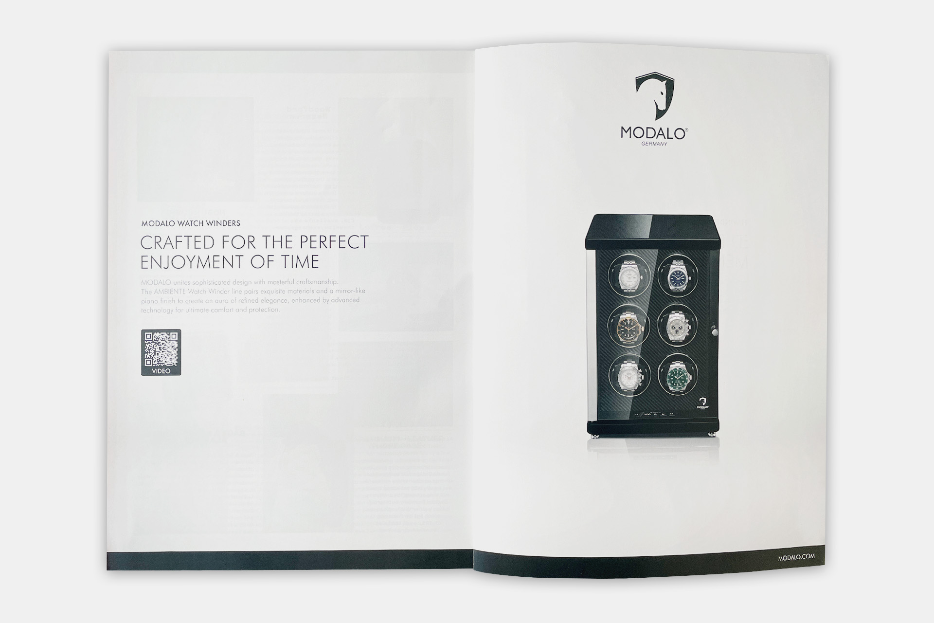 MODALO impresses with a prominent double-page advertisement for the AMBIENTE watch winder collection. The noble models made of New Zealand wood with piano lacquer finish and LED lighting ideally complement collector's pieces from Rolex to Omega and ensure their perfect value retention.