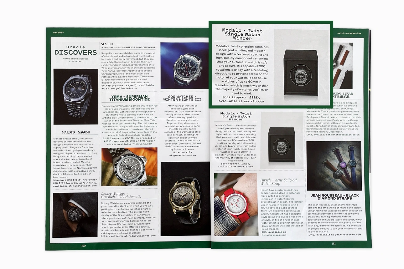 The MODALO Twist Collection has been featured in issue 121 of Oracle Time Magazine in the Watch Accessories section. The collection stands out for its modern design, high-quality craftsmanship, and reliable technology for discerning watch enthusiasts.
